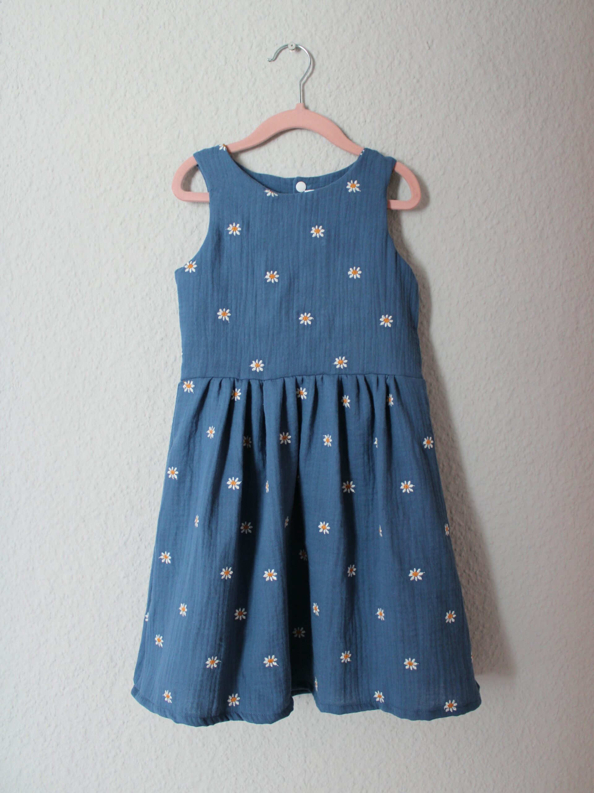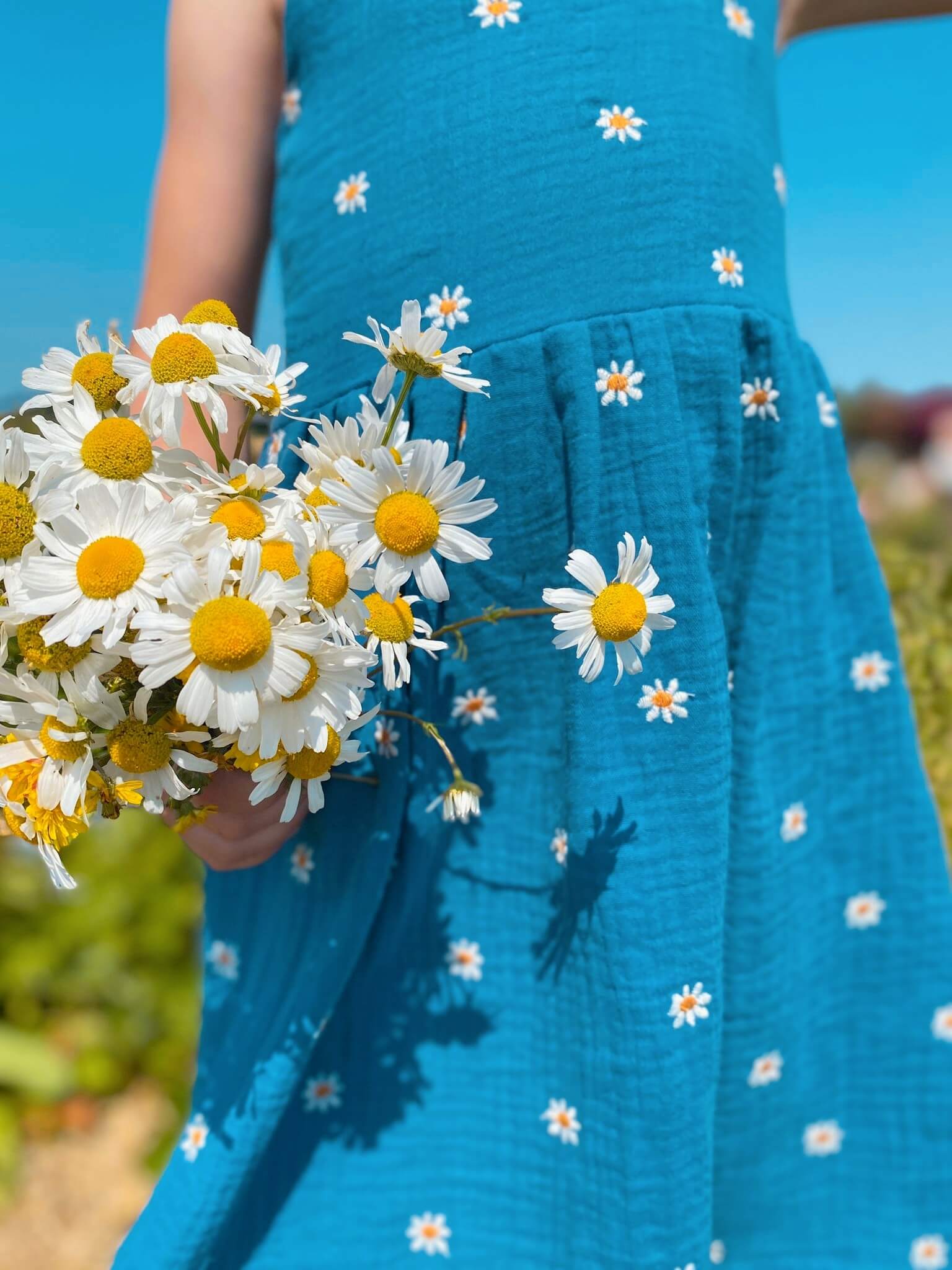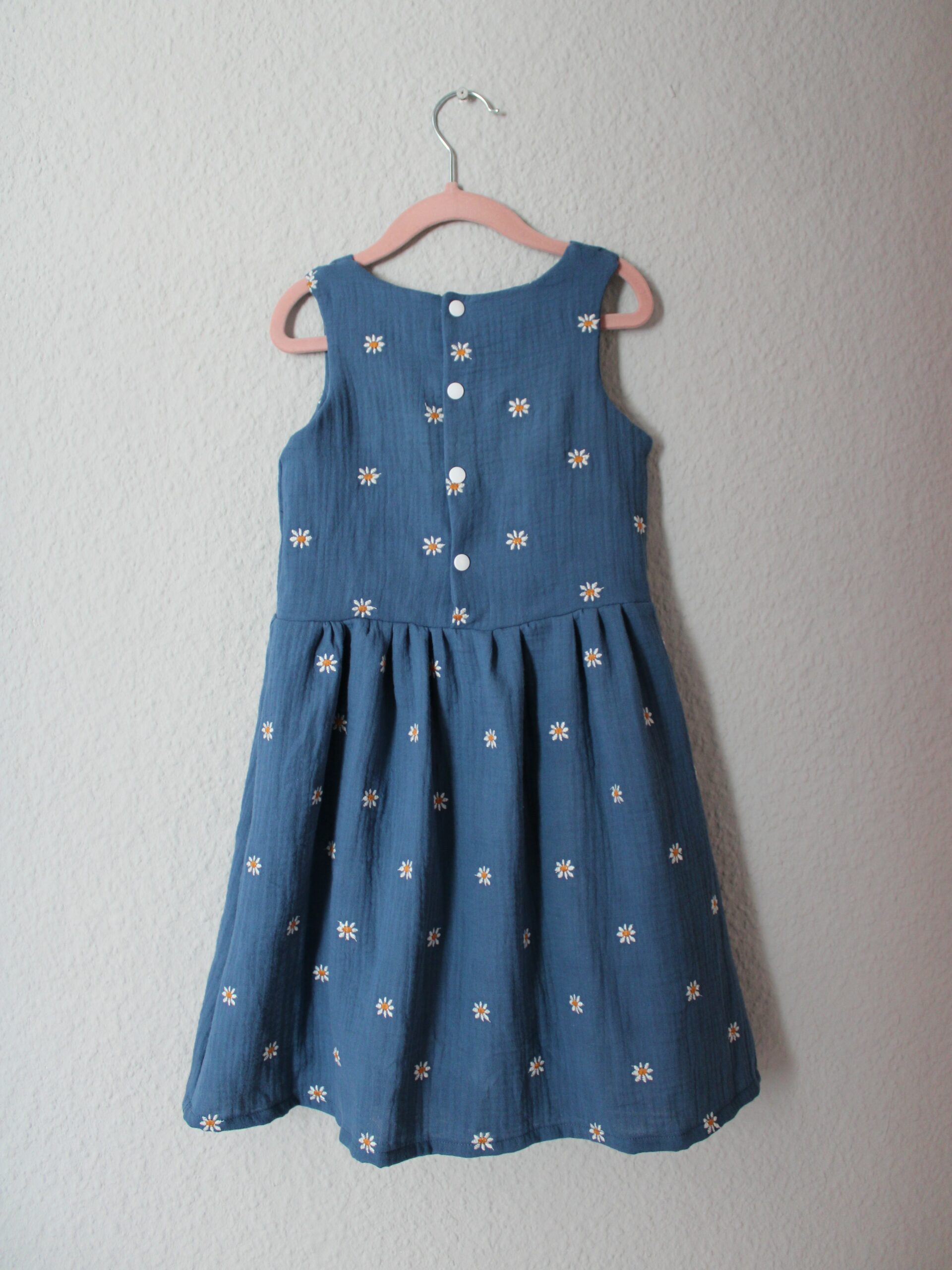 Süßes Sommerkleid aus angenehm weichem Musselin mit Gänseblümchen. Durch den luftig-leichten Musselin Stoff ist das Kleid perfekt geeigent für die heißen Sommertage und bietet ein super Tragegefühl. Das Oberteil ist doppellagig gefertigt, hinten mit Druckknöpfen aus Kunststoff zum Öffnen. Alle unsere Kleider werden ausschließlich in unserem berliner Atelier genäht.