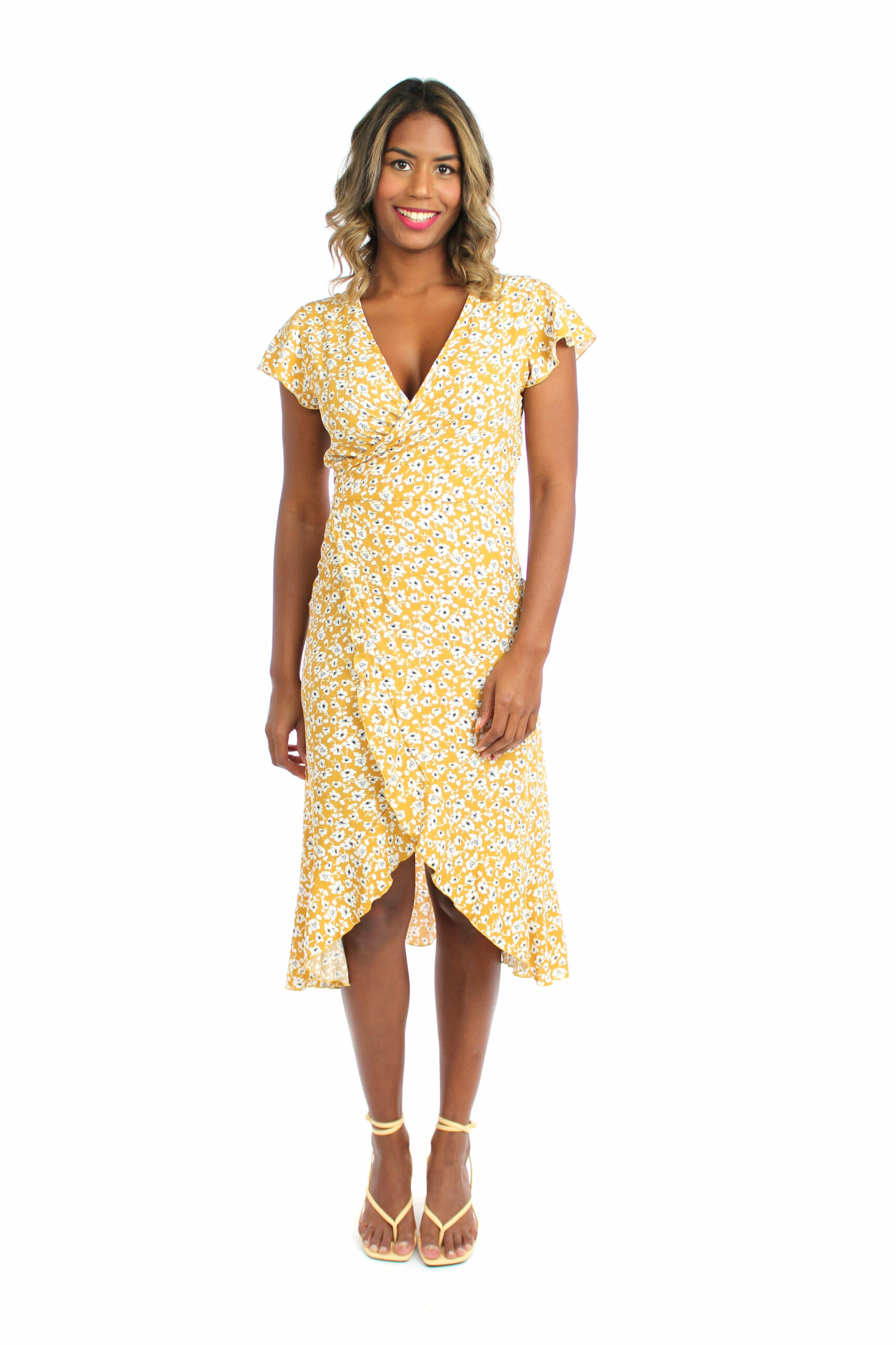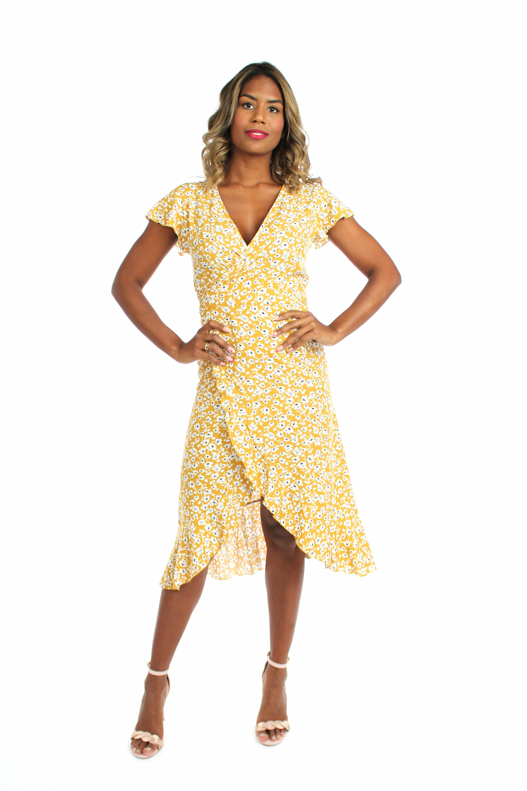 Das perfekte Kleid für den Sommer! Mit diesem Wickelkleid bist du an den heißen Tagen im Sommer immer perfekt angezogen. Der leichte Viskosestoff hat einen sommerlichen Blumenprint in gelb weiß. Durch die Volants und den leichten Viskosestoff schwingt der Rock in der Bewegung wunderbar mit.
