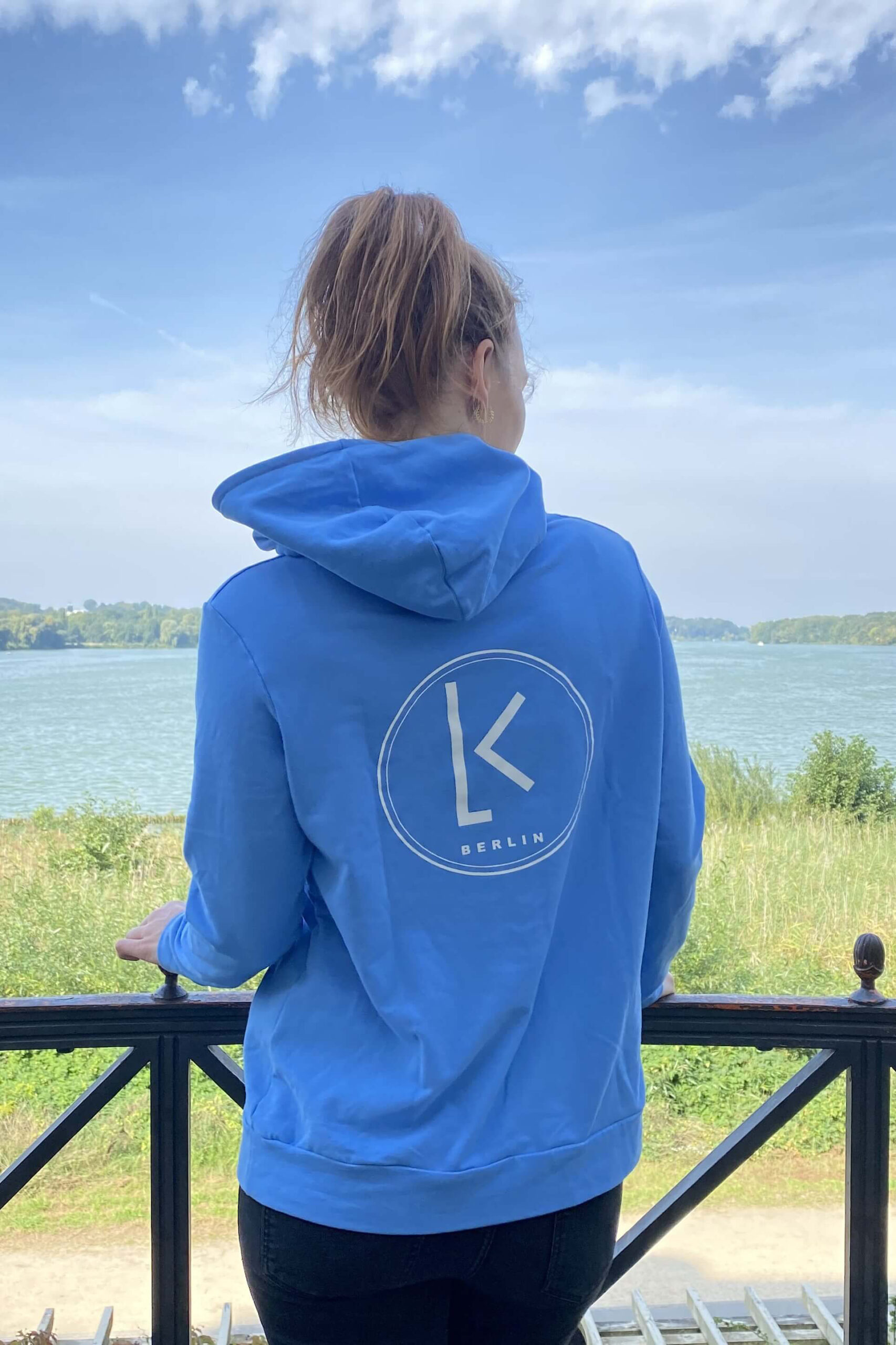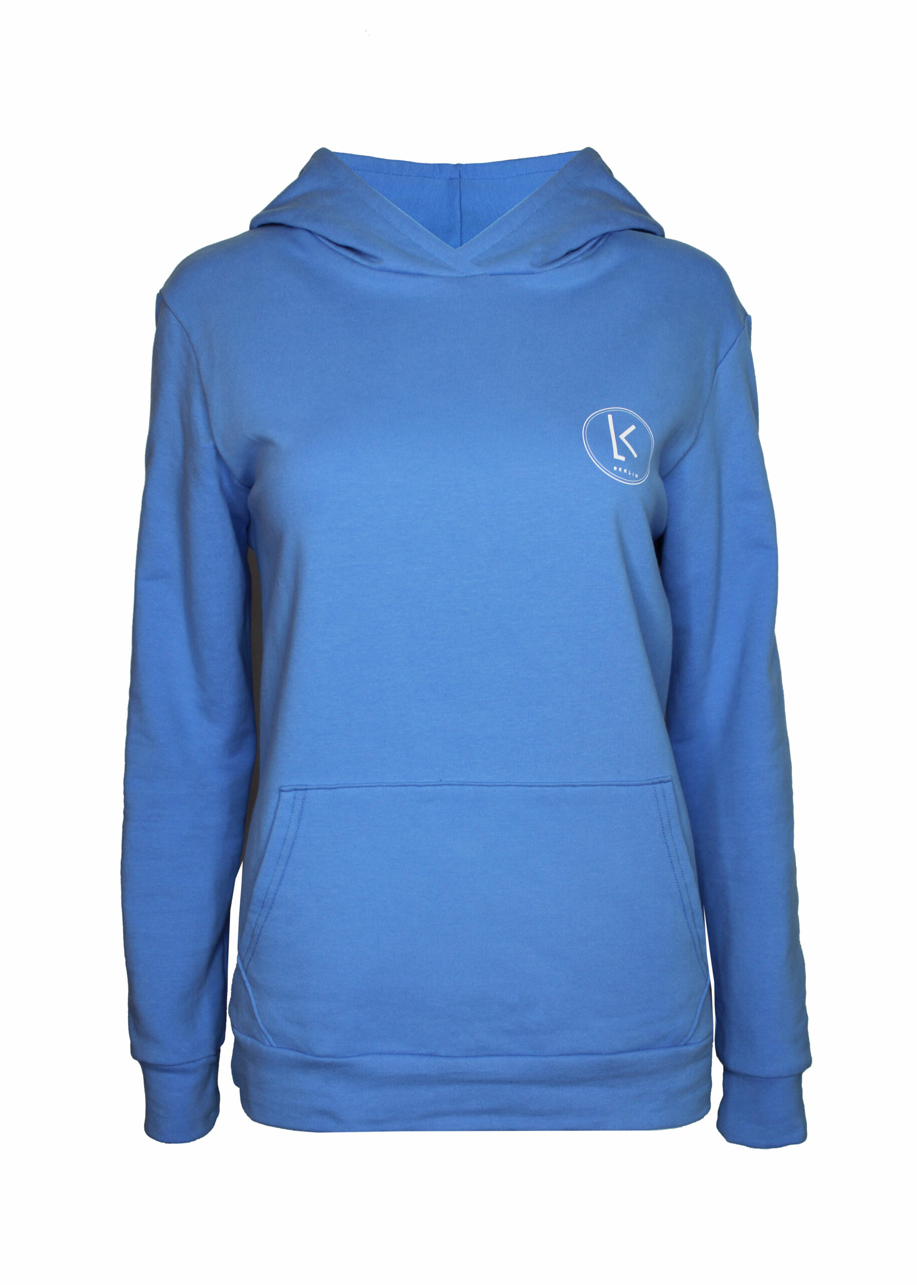 Klassischer Hoodie aus angenehmem, weichem Sweatstoff mit gebürsteter Innenseite in einem strahlenden Blauton. Der gemütliche Kapuzenpullover hat eine lockere Passform und bietet maximalen Tragekomfort. LA.LUKA Berlin Logo-Print auf der Vorderseite und der Rückseite. made in Berlin