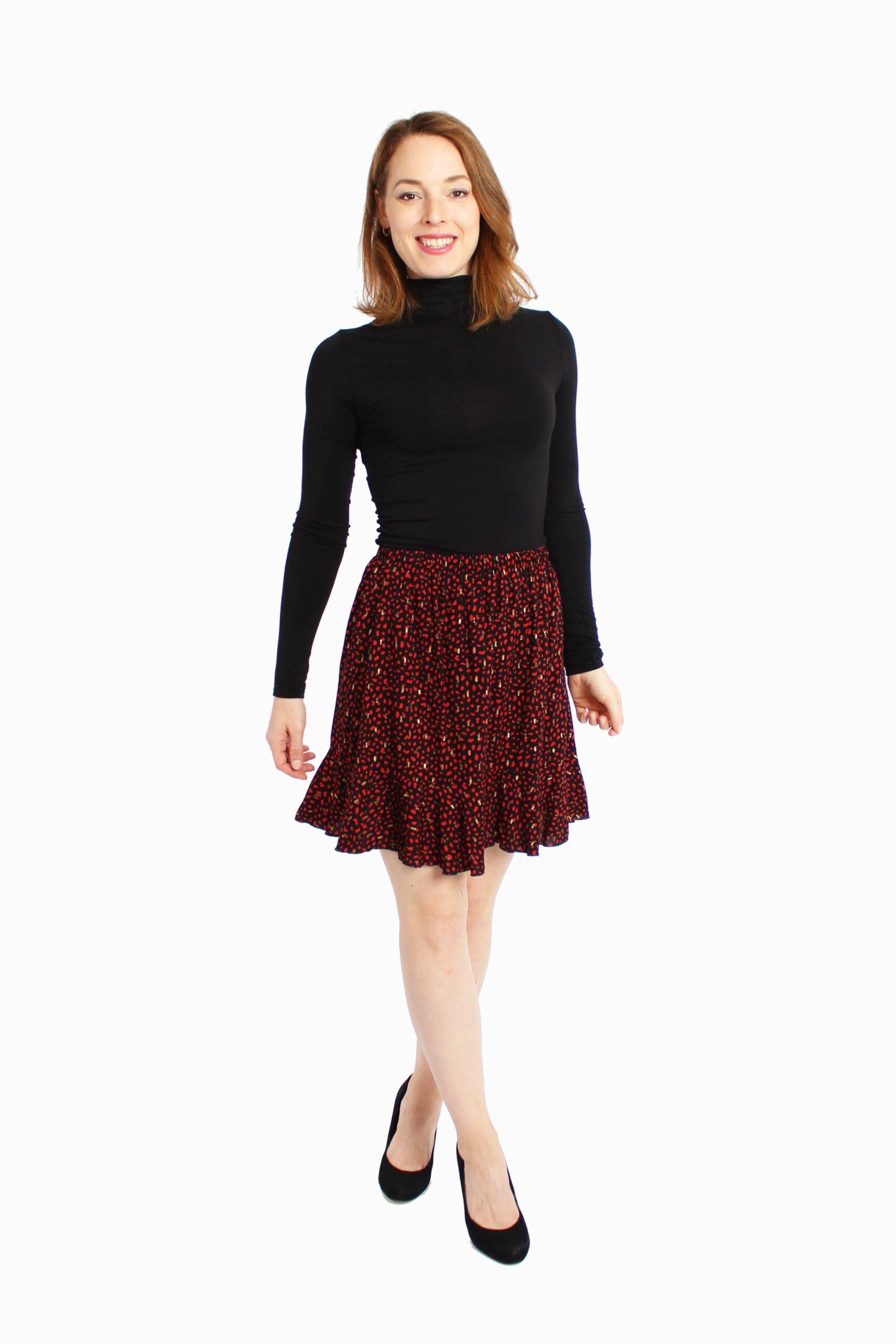 Ein Minirock, der die Blicke auf sich zieht und gleichzeitig einen Hauch von Eleganz und Verspieltheit versprüht – das ist unser neuer Minirock in schwarz mit roten Punkten. Durch den Stoff ziehen sich goldene Lurexfäden, die ein Punktemuster ergeben. Hergestellt aus leichtem Viskosestoff, fühlt sich dieser Minirock unglaublich angenehm auf der Haut an und bietet optimalen Tragekomfort. Das Gummiband an der Taille sorgt für eine perfekte Passform und ermöglicht ein einfaches An- und Ausziehen. Der Rock kann sowohl lässig mit einem einfachen T-Shirt als auch schick mit einer eleganten Bluse getragen werden.