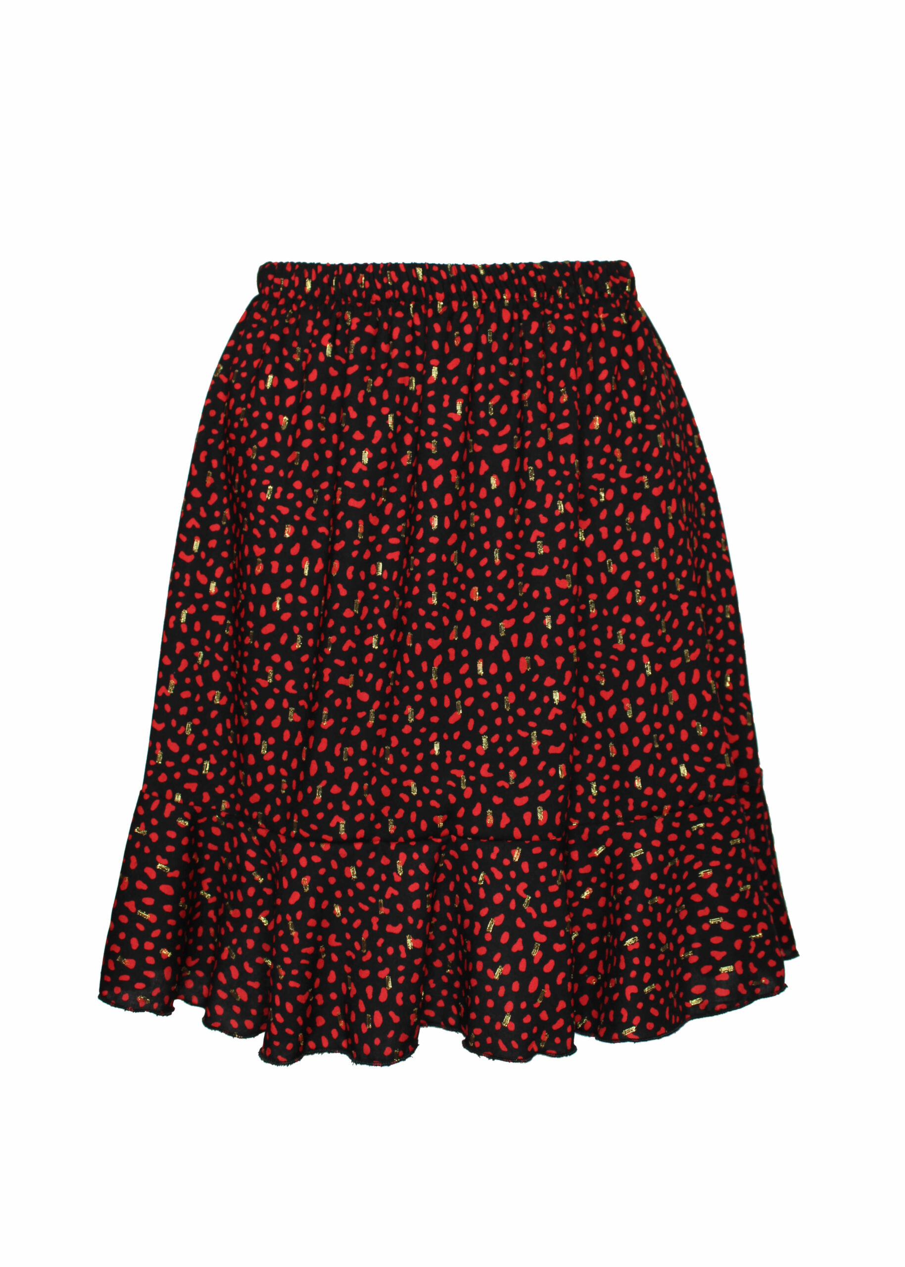 LA.LUKA Berlin – Schwarzer Minirock mit roten und goldenen Lurex-Punkten und Volant