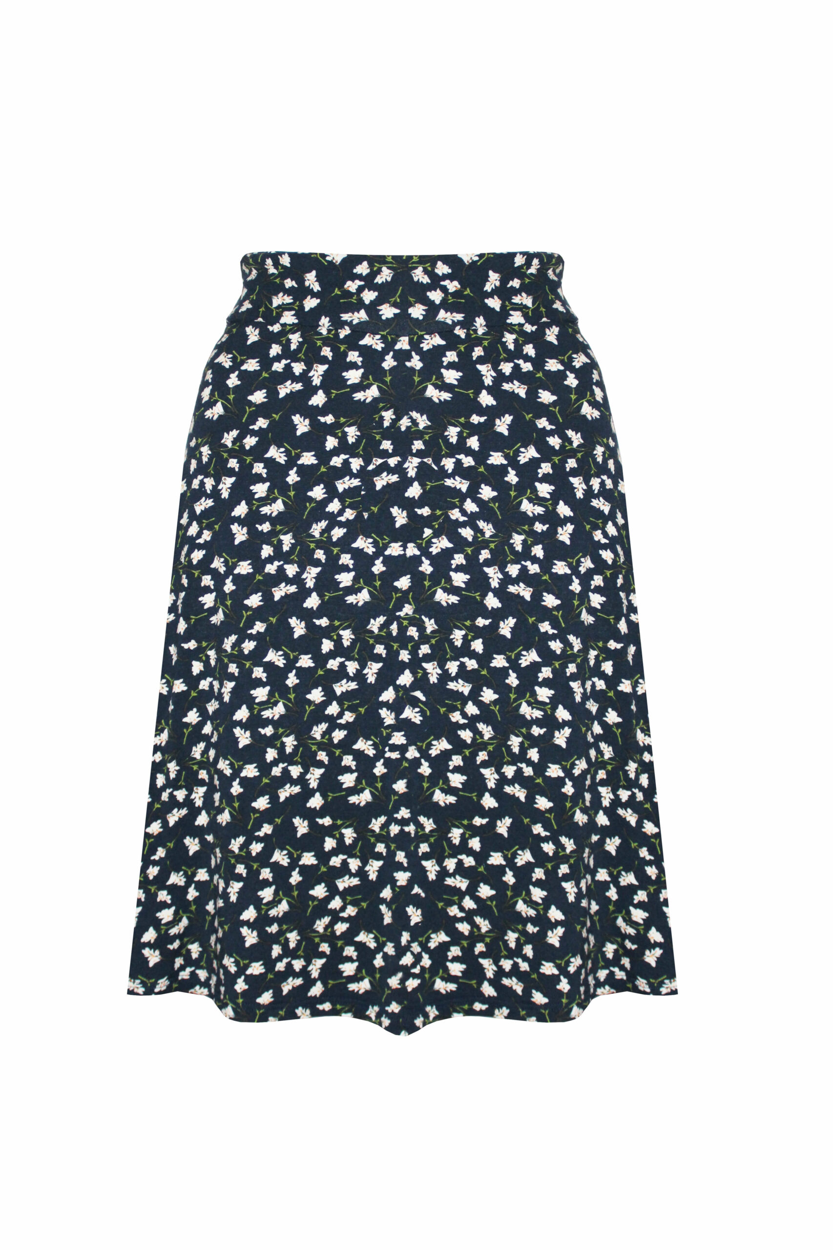 - made in Berlin Ein sommerlicher A-Linienrock aus bequemen Viskosejersey. Der dunkelblaue Stoff hat ein wunderschönes Blümchenmuster. Der Rock sitzt direkt auf Taillenhöhe, der elastische Bund sorgt für einen angenehmen Sitz. Ein Rock, perfekt für den Alltag, der sich wunderbar mit unserem dunkelblauem Shirt aus der Sommerkollektion kombinieren lässt.