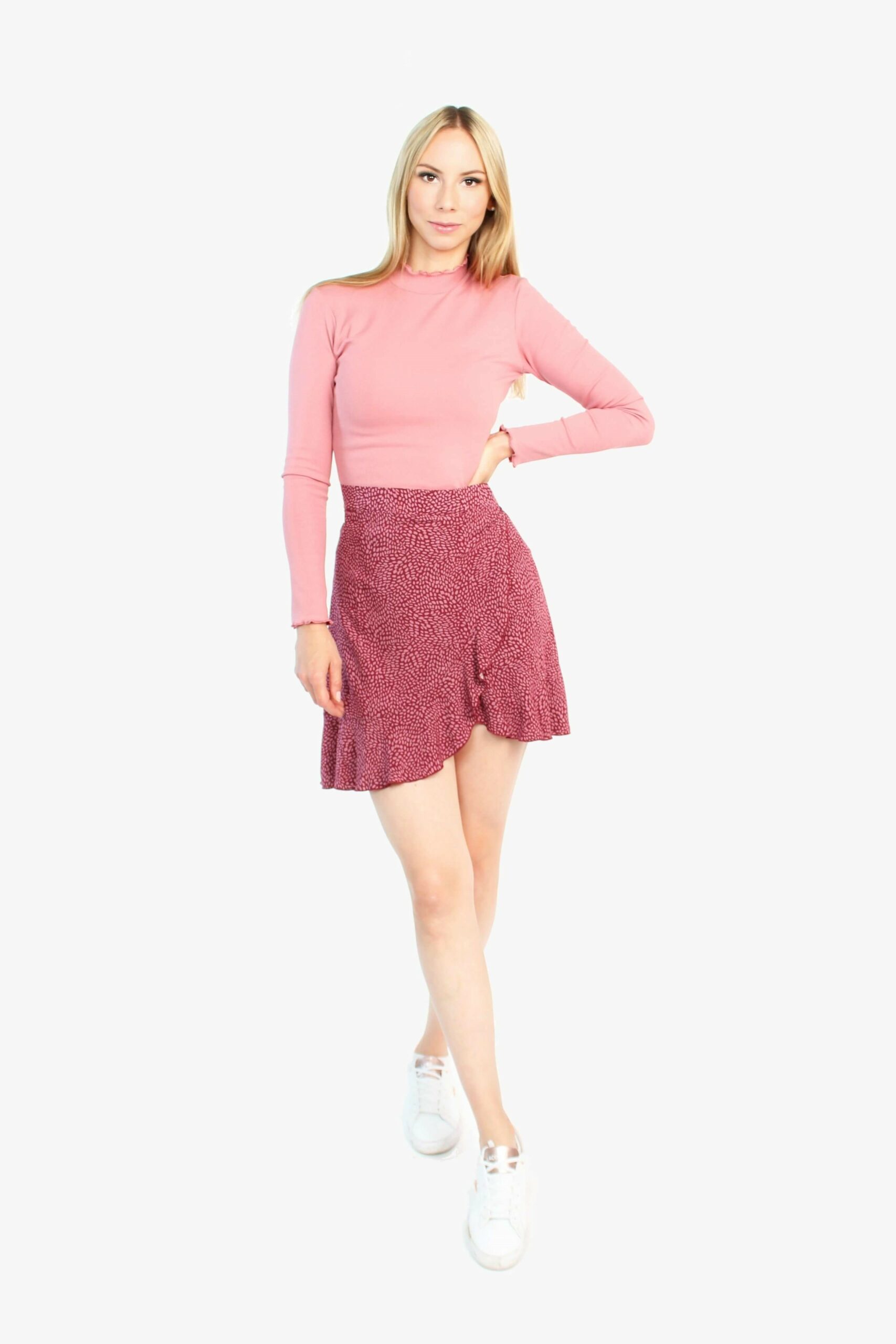 • Mini-Wickelrock mit asymmetrischem Volantsaum. Der Rock besteht aus einem leichten Viskosestoff im herbstlichen bordeaux/rosé und wird direkt auf Taillenhöhe gebunden. Der Viskosestoff liegt sehr leicht auf der Haut und bietet ein angenhmes Tragegefühl. Der Wickelrock könnte nicht vielseitiger sein. Ob im Alltag mit Strumpfhose und Boots oder zur Party mit High heels, mit diesem Rock bist du immer perfekt angezogen.