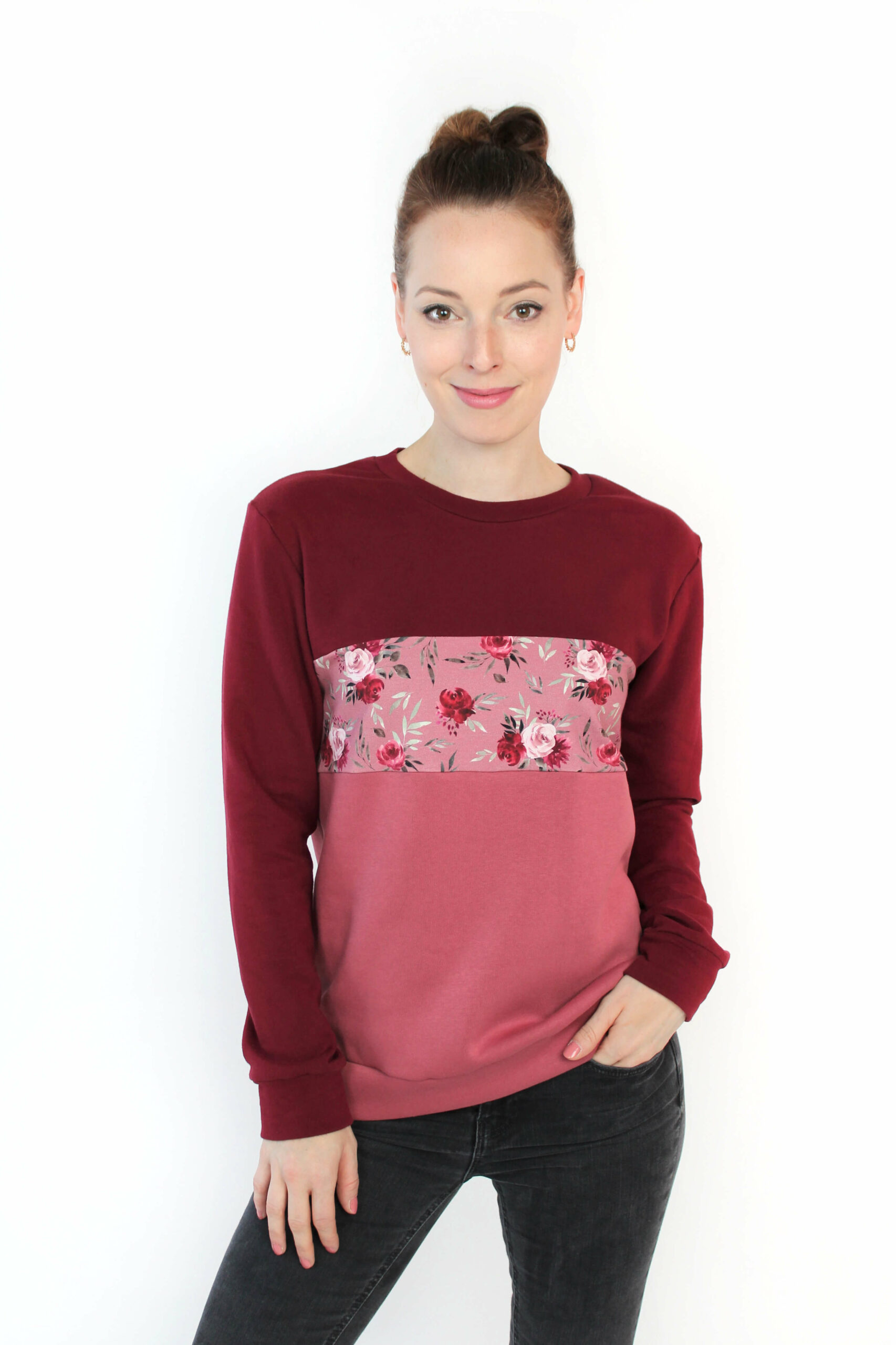 Schreibe die erste Bewertung zu “Sweater bordeaux rosé geblümt”
