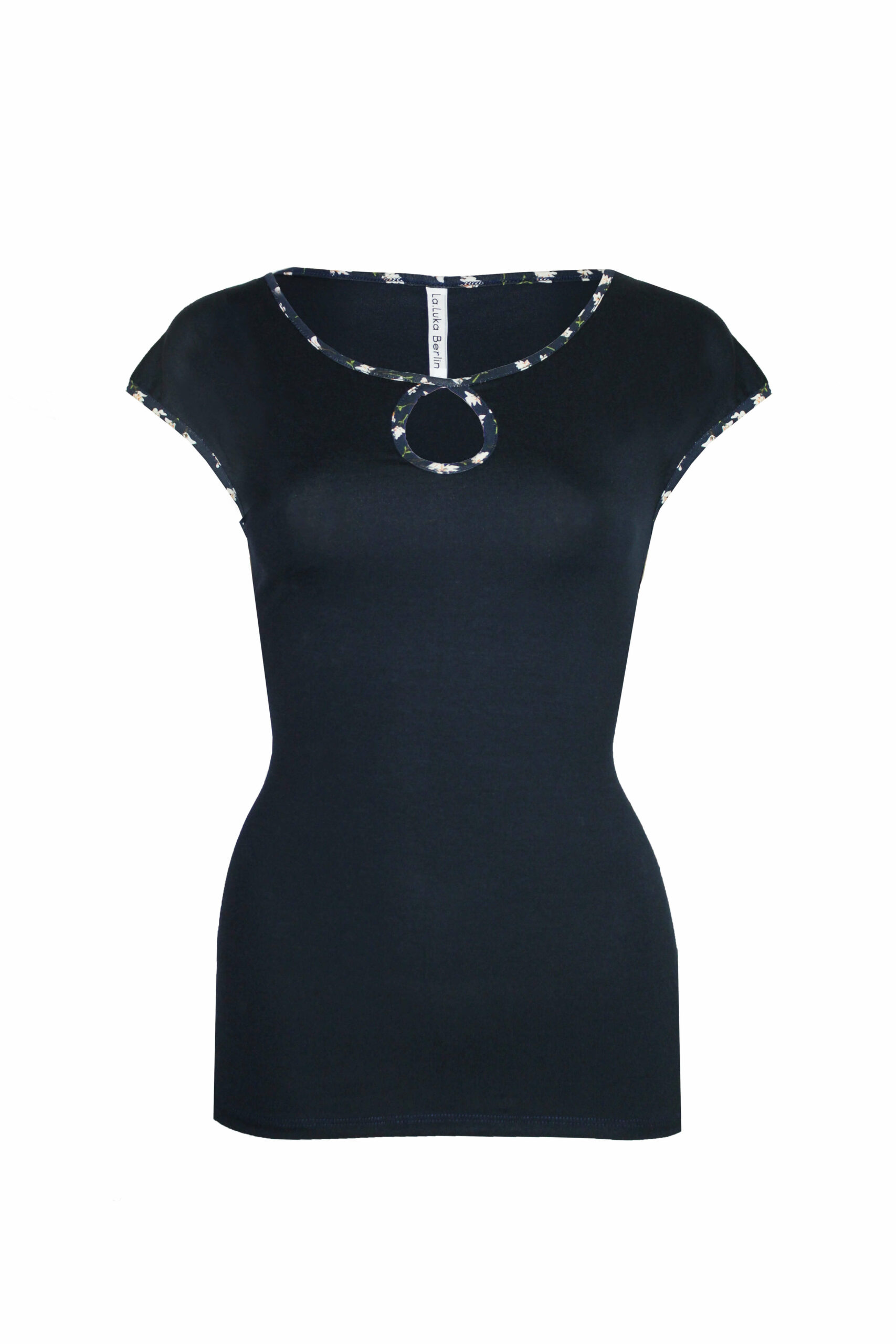 - made in Berlin Ein sommerlicher Shirt aus bequemen Viskosejersey. Das Shirt ist am Ausschnitt abgesetzt mit einem Blumenprint Jersey. Der Schlüsselloch-Ausschnitt sorgt für den Eyecatcher bei diesem Shirt. Passend dazu haben wir einen Jerseyrock mit Blumenprint.