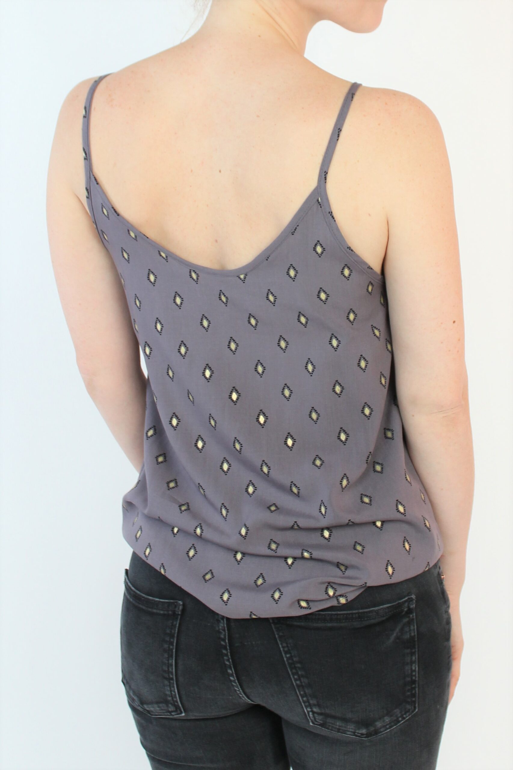 - made in Berlin Das Trägertop aus leichten Viskosestoff hat einen lockeren Sitz. Das Top besitzt ein Rautenmuster mit goldenen Highlights. In dem selben Stoff haben wir noch einen Wickelrock