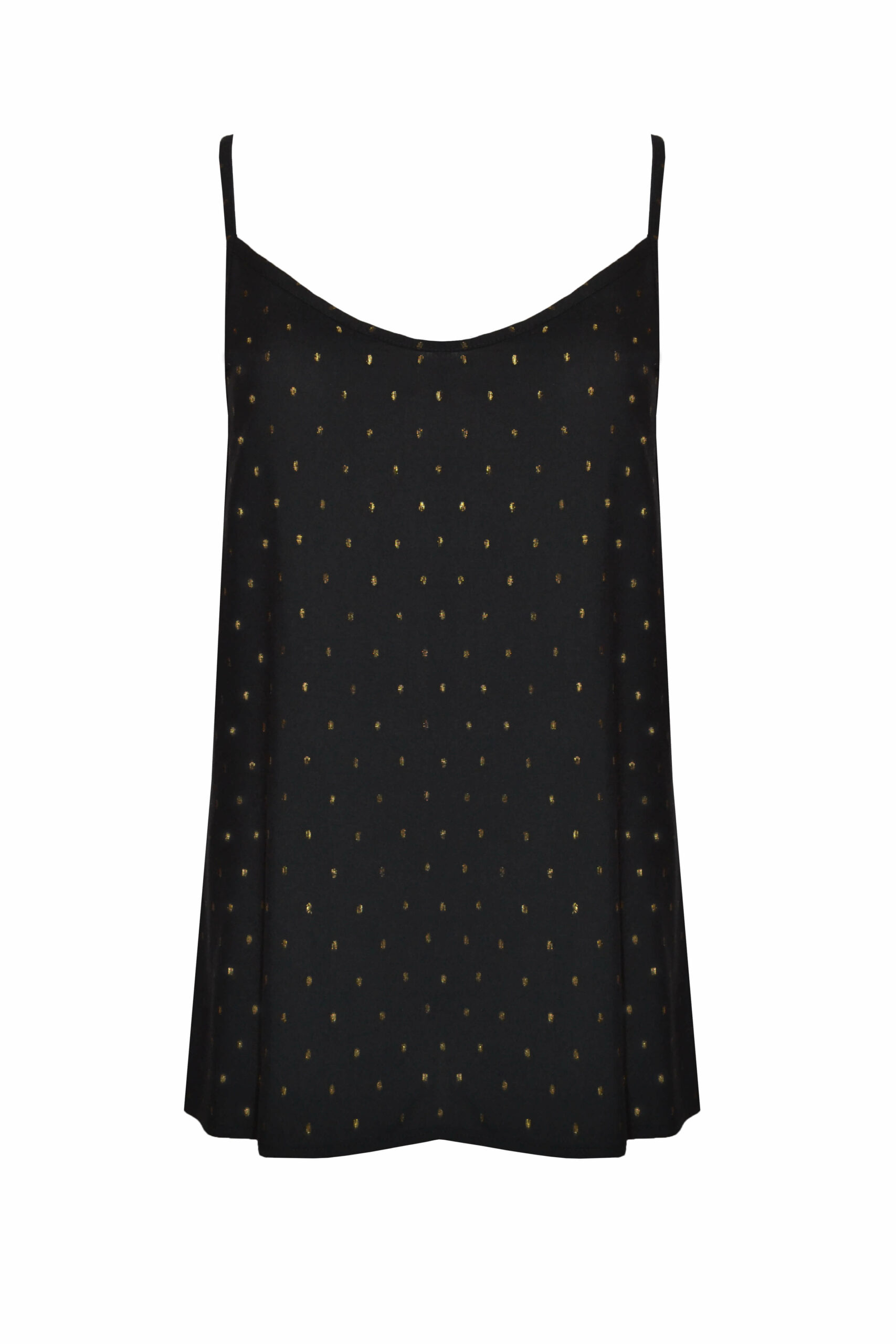 - made in Berlin Durch den leichten Viskosestoff und den lockeren Sitz ist dieses Trägertop perfekt geeignet für die heißen Sommertage.Durch den Viskosestoff ziehen sich goldene Lurexfäden, die ein Punktemuster ergeben. In dem selben Stoff haben wir noch ein Wickelrock sowie ein Hängerchen und ein Maxikleid